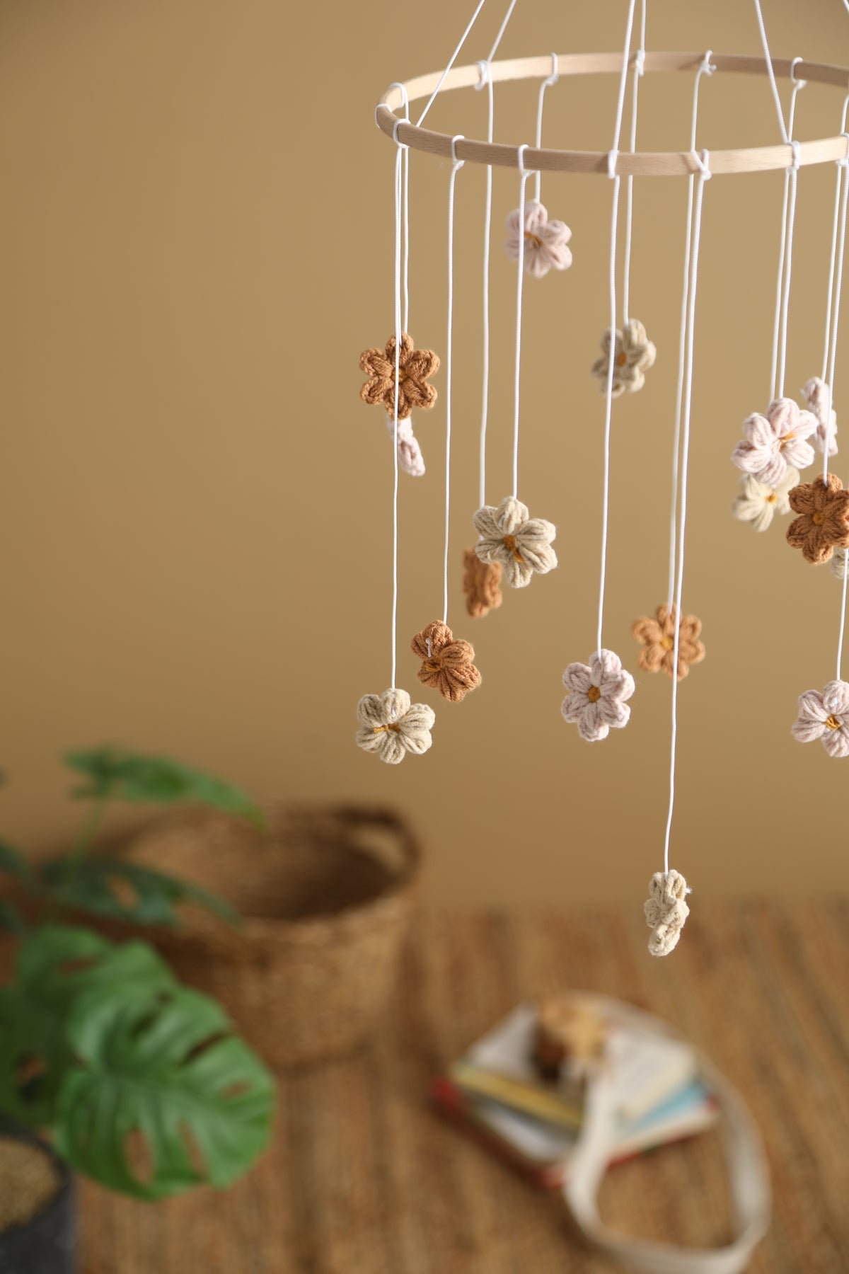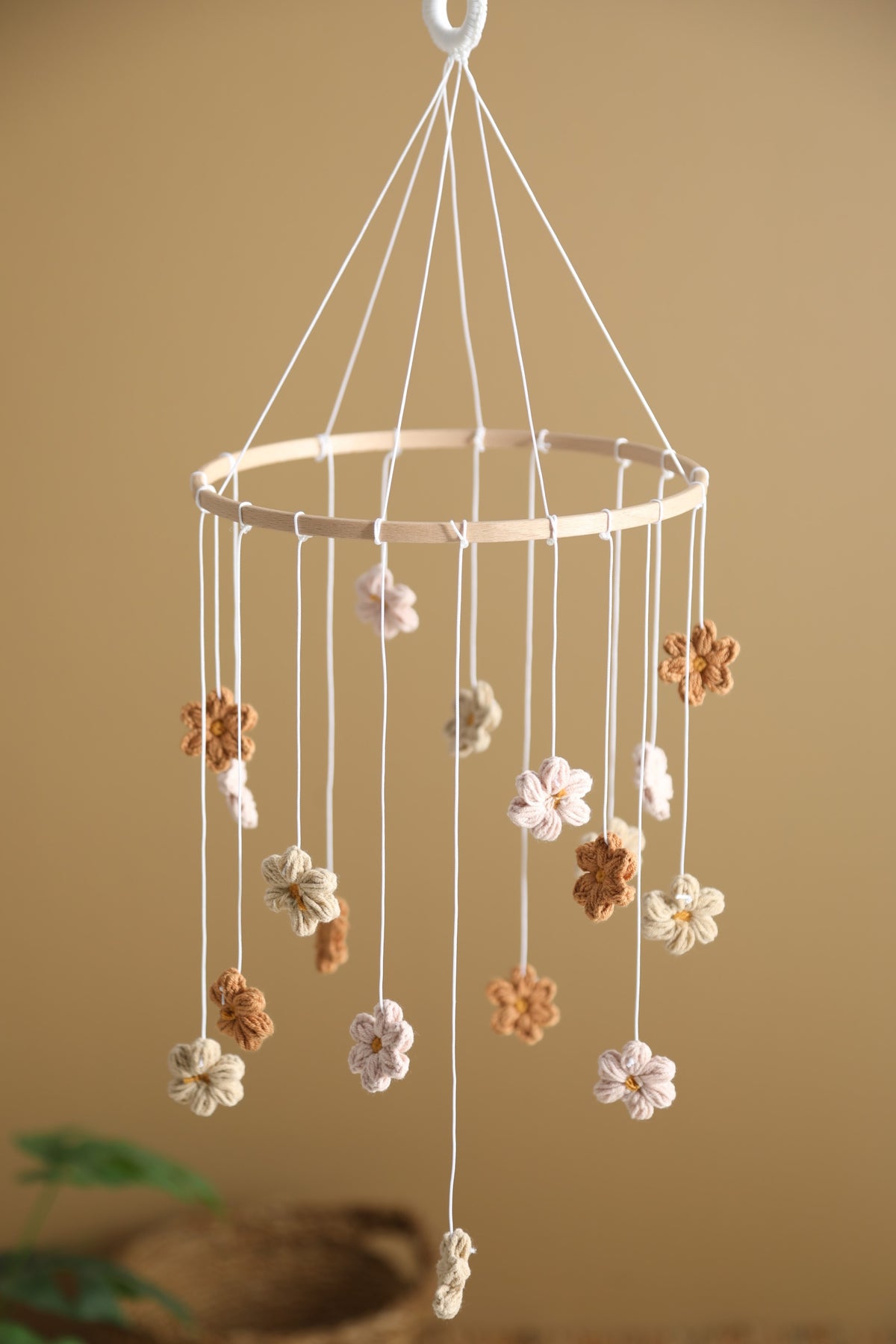 Dieses zarte Baby-Mobile wurde in liebevoller Handarbeit aus weichem, hochwertigem Baumwollgarn gefertigt. Die gehäkelten Mini-Blumen in beruhigenden Farbtönen schweben sanft über dem Bettchen Ihres Babys und schaffen eine friedliche und verträumte Atmosphäre.