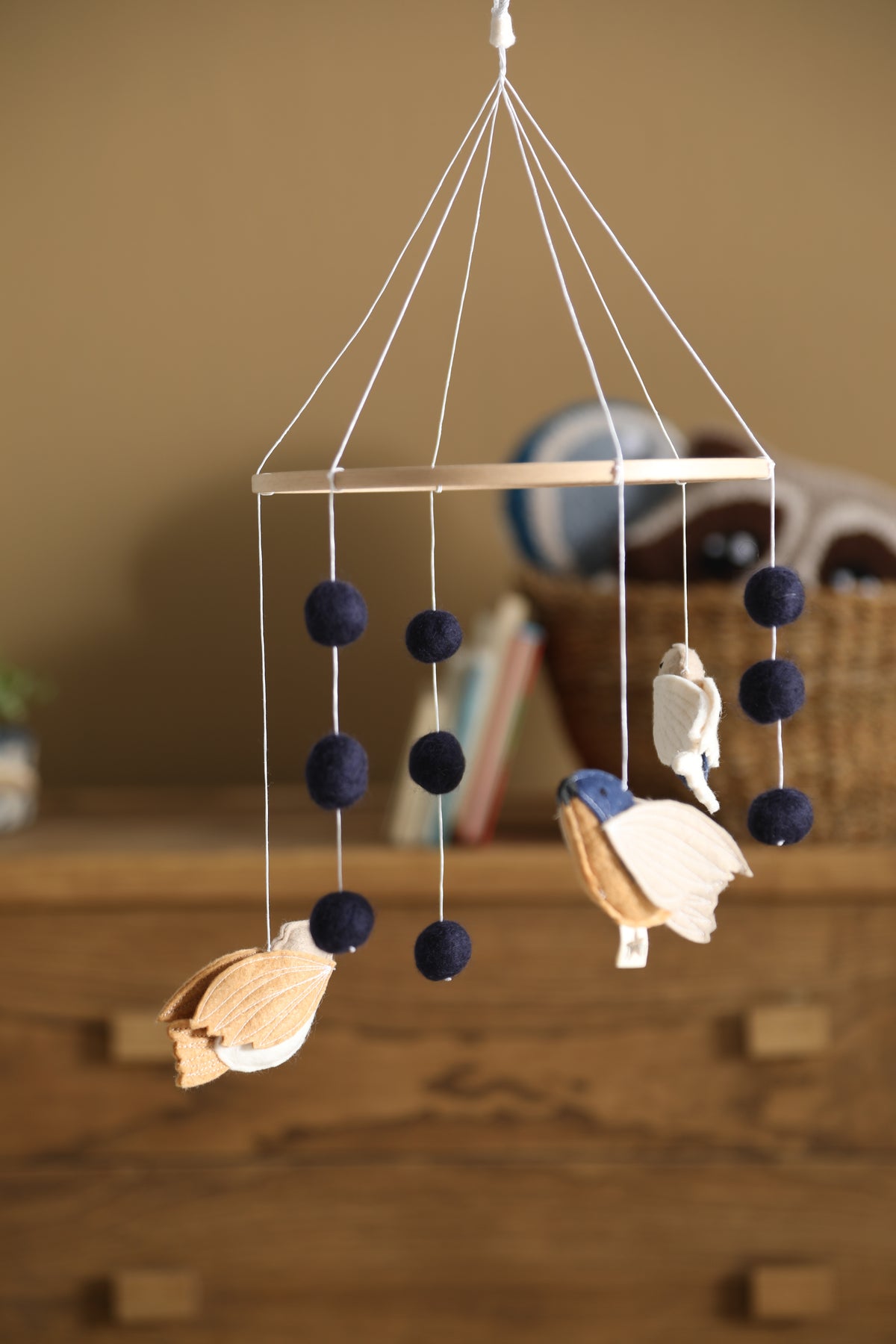 Verleihen Sie dem Kinderzimmer Ihres Babys mit unserem handgefertigten Vogel-Mobile einen Hauch von Laune. Dieses bezaubernde Mobile zeigt zarte Filzvögel in sanften, neutralen Tönen, die Ihr Kind in den Schlaf wiegen. Jeder Vogel ist an einem natürlichen Holzreifen aufgehängt und wird von Filzkugeln begleitet, die eine sanfte, beruhigende Bewegung erzeugen.